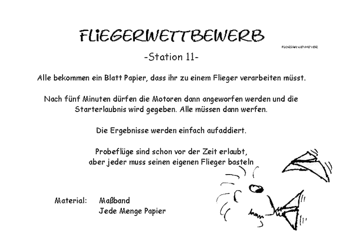 Die Gruppe hat 5 Minuten Zeit, dass jeder seinen EIGENEN Flieger faltet und testet. Nach der abgelaufenen Zeit müssen alle geworfen werden.